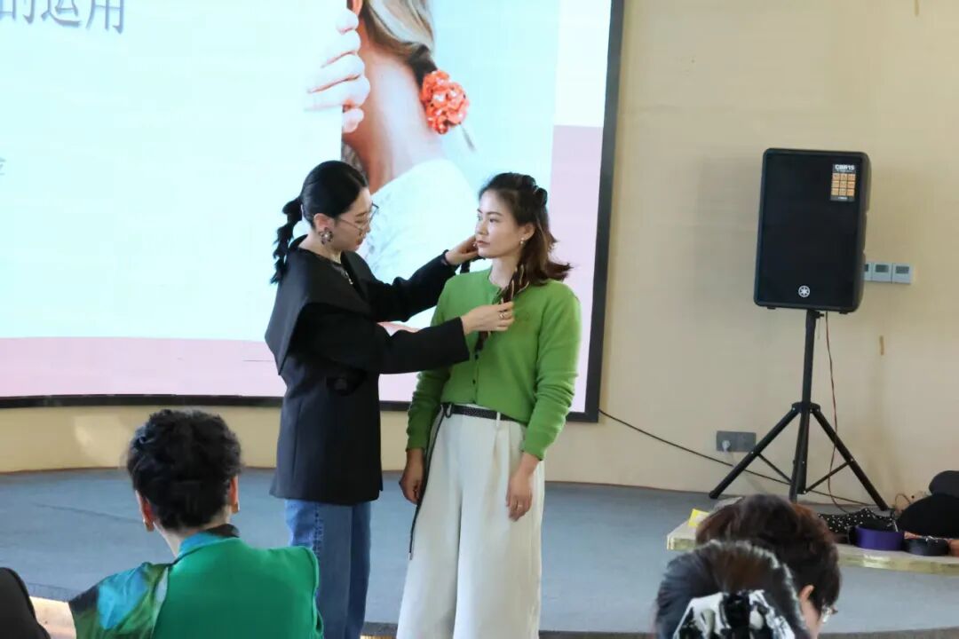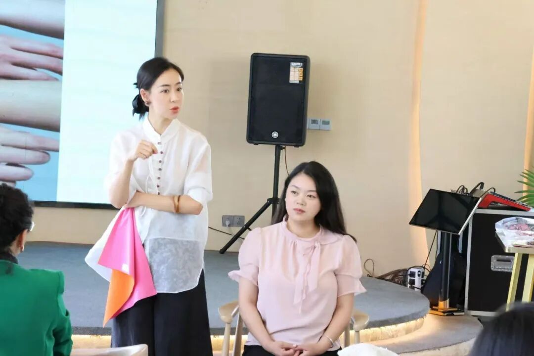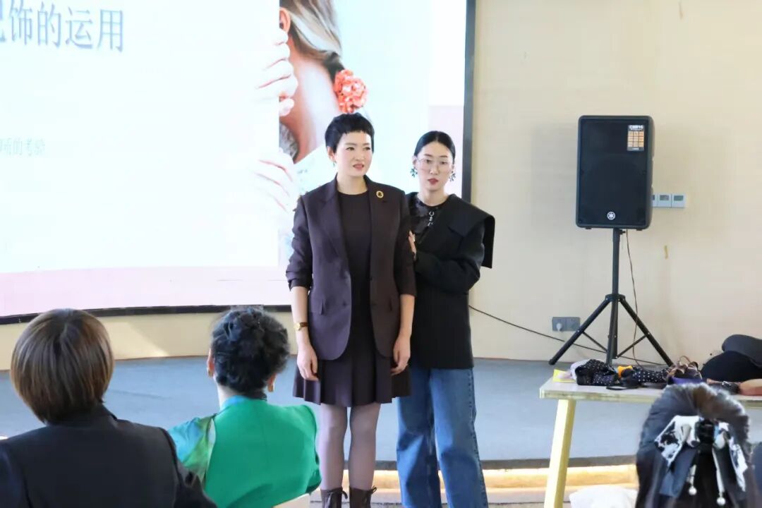 Yanjie的美学花园形象美学创始人闫洁老师,则聚焦美学理念与穿搭搭配。她从高级美学核心要素切入,讲解如何通过色彩、版型、材质的和谐搭配凸显个人气质,重点分享西装、衬衫等职场单品的“一衣多穿”思路;在配饰环节,深度解析丝巾系法、配饰与服装风格的适配技巧,通过实际搭配案例,演示如何用小配饰提升整体造型精致度与高级感 。