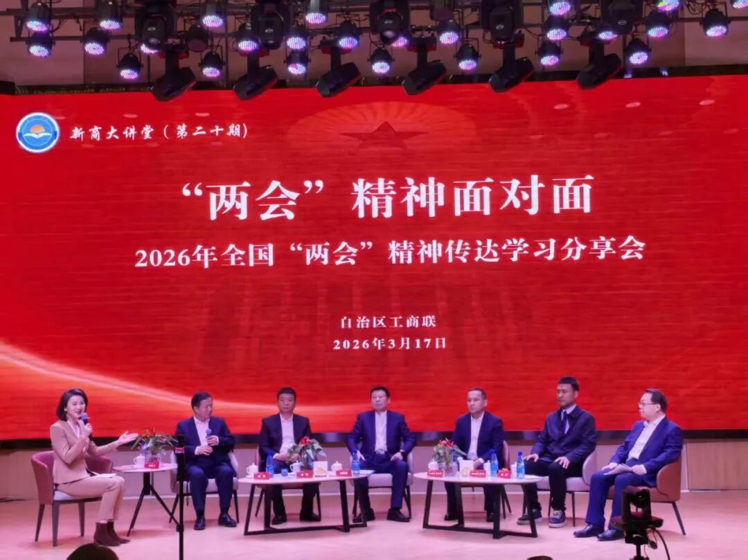 3月17日,自治区工商联(总商会)举办新商大讲堂(第二十期)——2026年全国“两会”精神传达学习分享会。会议特邀5位在疆全国人大代表、住疆全国政协委员,传达解读全国两会精神、政府工作报告核心要义及“十五五”时期发展目标与重点任务,结合自身履职经历分享参会感悟与学习心得。现场180余名新疆民营企业家齐聚学习,全疆各级工商联及商协会1万余名成员通过线上形式同步参与本次活动。自治区女企业家联合会会长金琳琳,副会长查瑞,理事李兴凡,会员印金花、陈丽、李霞,办公室主任孙彩霞参加此次学习分享会。 第十四届全国人大代表、全国工商联副主席、特变电工股份有限公司党委书记、董事长张新表示,2026年全国两会是“十五五”开局之年的重要盛会,政府工作报告为高质量发展划定了新目标、明确了新方向。新疆民营经济要深学细悟两会精神,推动科技创新与产业创新深度融合,立足新疆资源禀赋和地缘优势,围绕产业链布局创新链、供应链,推动资源优势向产业优势、发展优势转化,为新疆经济社会高质量发展注入强劲动力。
